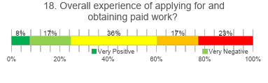 Experiences of the workplace are in line with those in Education, in that they are predominantly negative. Figure 18. Overall Experience of applying for and obtaining paid work shows that from the outset our community is facing hurdles to even get paid work, let alone their experiences in work, or work retention rates. A study around work retention rates, and reasons for leaving and/or staying would shed further light on best practices that improve retention rates for neurodivergent individuals. Only 9% felt that their experience of workplace support was positive or very positive, with 53% finding it negative or very negative. This was no doubt affected by respondents’ experience of workplace bullying, with 69% saying that had experienced it in some fashion. There is a clear correlation with discrimination and disclosure, with 65% saying they felt they had experienced it because of being neurodivergent, and only 4% saying that they had always felt safe disclosing their disability.