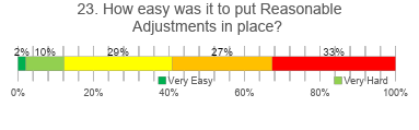 Figure 23 How easy was it to put Reasonable Adjustments in place? Illustrates that there is a significant gap between what respondents feel they need, and the ease (let alone success) with which they can get it, as only 2% felt it was very easy, and 4% saying it was easy. A significant 59% said it was either hard or very hard (26% and 33% respectively).
